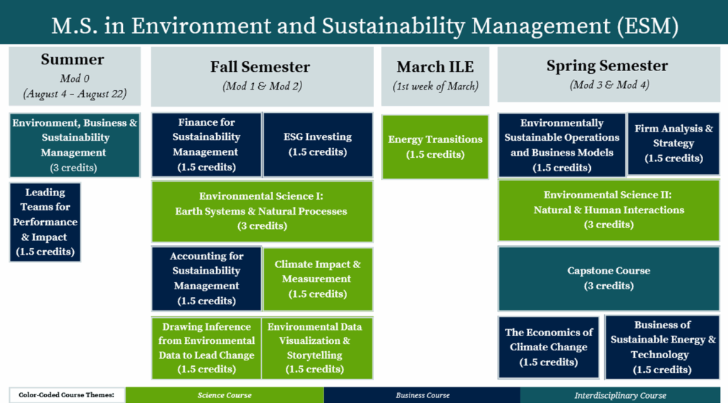 All Master’s in Environment and Sustainability Management (MS-ESM) students take the same courses in the same order as part of our cohort model. Preliminary course descriptions for your courses are available below.